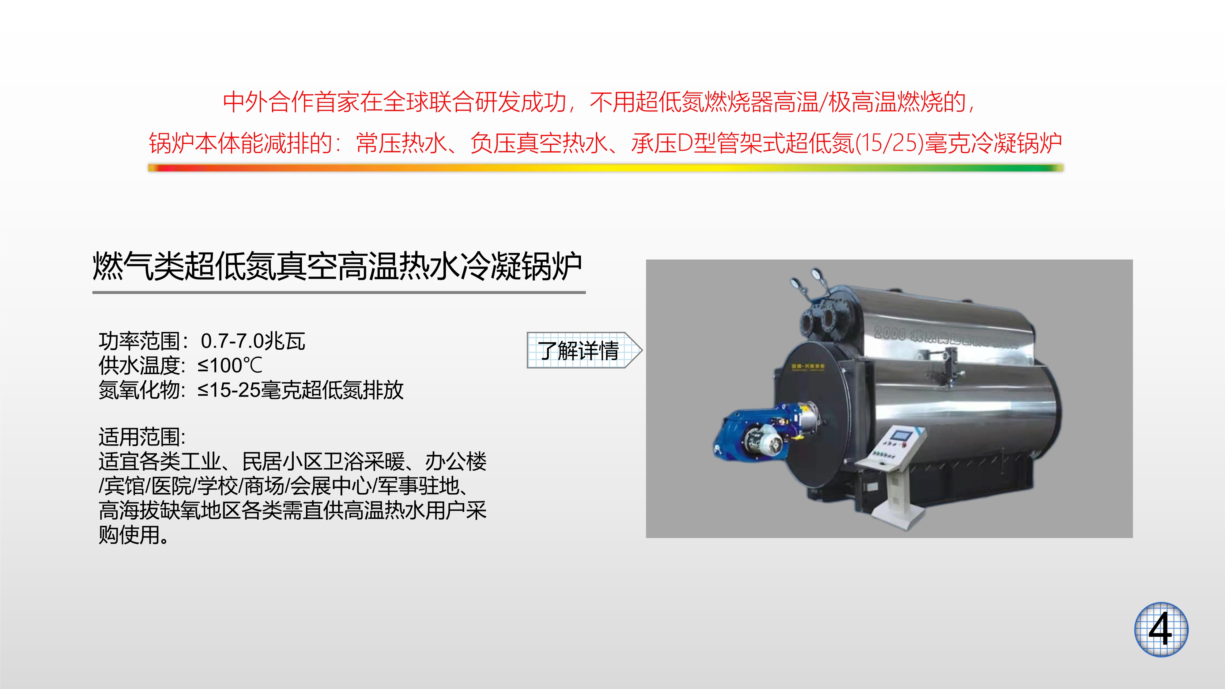 公司主要生產(chǎn)經(jīng)營燃油、燃氣、電加熱三大系列的蒸汽鍋爐、常壓熱水爐、真空鍋爐/真空熱水鍋爐、熱載體導熱油鍋爐、不銹鋼飲水鍋爐、開水爐,蒸汽發(fā)生器,煙氣器等產(chǎn)品。